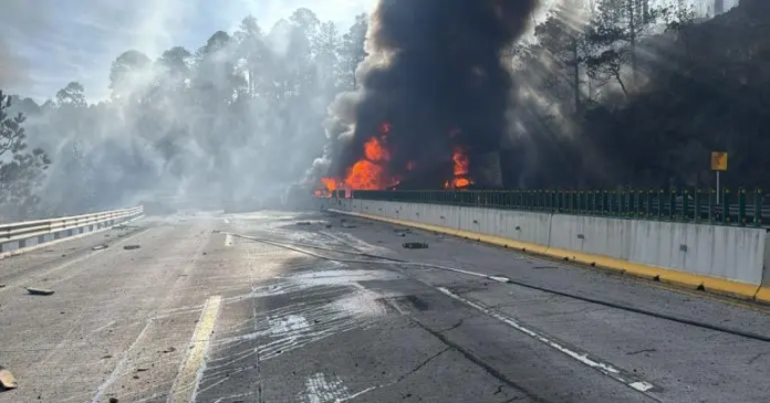 Fue en el kilómetro 53 donde producto de estos impactos se registró la explosión de una pipa de gas, por lo cual se cerró la circulación en ambos sentidos.