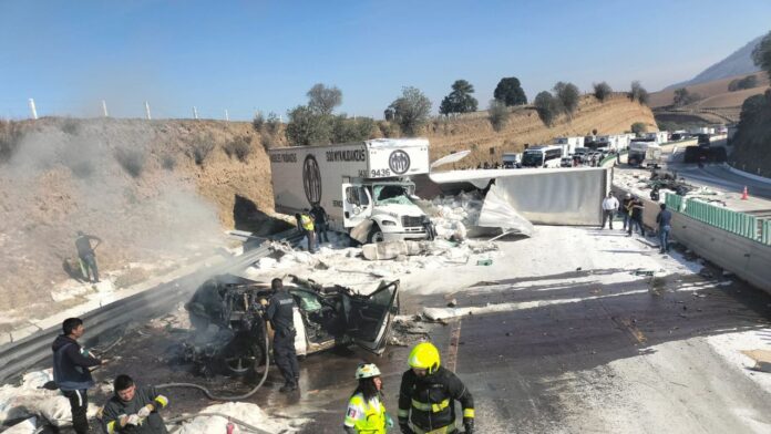 Un aparatoso accidente en la autopista México-Puebla en el Estado de México cobró la vida de una persona y dejó al menos 5 heridos luego del impacto que provocó la volcadura de un tráiler y un automóvil completamente calcinado, en el kilómetro 46, cerca de la localidad de Río Frío,