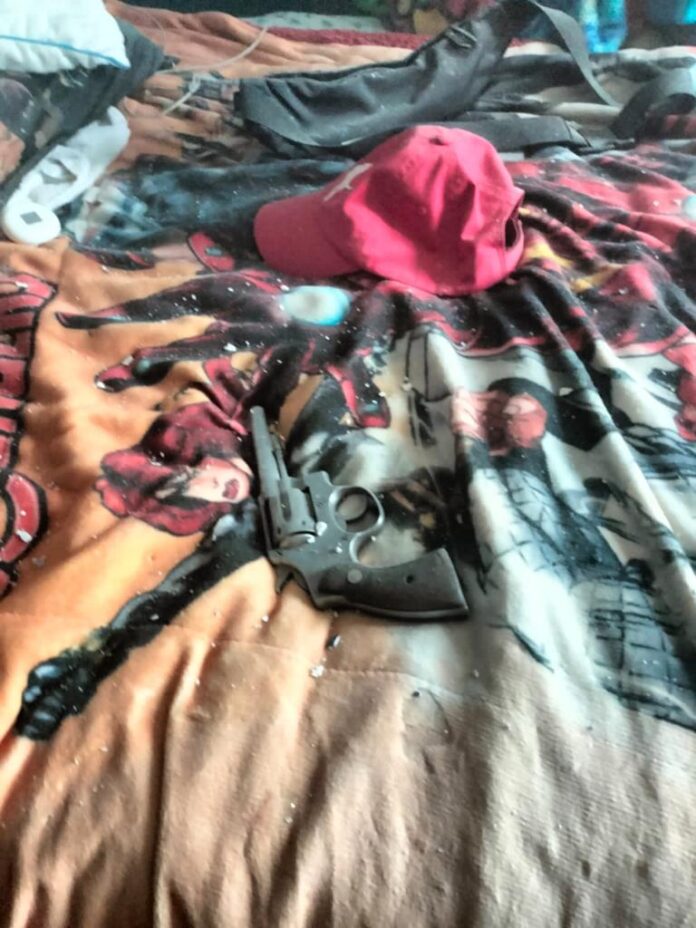 En el domicilio se encontraron dos armas de fuego, un tipo revolver y otra tipo escuadra, entre 20 y 30 cartuchos no percutidos y más de tres kilos de hierba color verde, con características a marihuana, y envoltorios con polvo blanco, así como el cuerpo de Gibrán “N”, de 29 años de edad.
