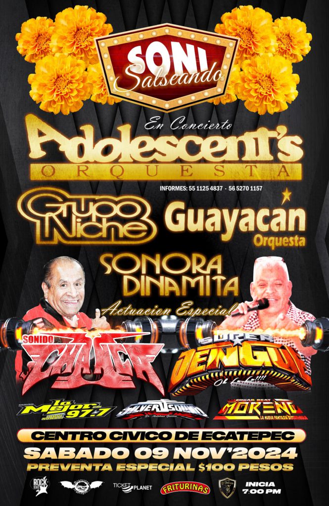 Adolescent´s Orquesta, Grupo Niche, Guayacan Orquesta, además de Sonido La Changa, Sonido Súper Dengue, Sonido La Mejor 97.7, Sonido Silver Sound y Sonido Moreno se presentan el próximo sábado 9 de noviembre de 2024, el Centro Cívico de Ecatepec a partir de las 7pm. Boletos a la venta en el Sistema Ticketplanet y en puntos de venta autorizados.