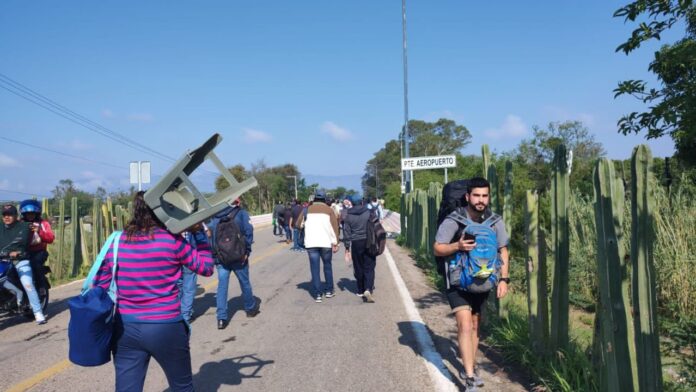 Maestros de la Sección 22 de la Coordinadora Nacional de Trabajadores de la Educación (CNTE) realizan este martes un bloqueo en inmediaciones del Aeropuerto Internacional Benito Juárez de Oaxaca, lo que ha provocado que muchos pasajeros presenten inconveniencias para llegar a tiempo a sus vuelos.