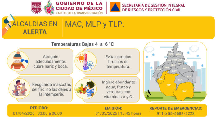Las demarcaciones bajo aviso son Álvaro Obregón, Benito Juárez, Coyoacán, Cuauhtémoc, Iztacalco, Iztapalapa, Magdalena Contreras, Miguel Hidalgo, Milpa Alta, Tláhuac, Tlalpan, Venustiano Carranza y Xochimilco, donde se prevén condiciones que podrían afectar la movilidad y generar riesgos para la población.
