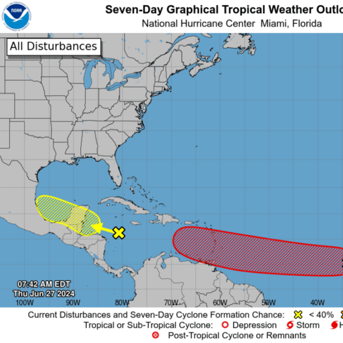 “Se pronostica que las condiciones ambientales serán propicias y se anticipa el desarrollo de este sistema. Es probable que una depresión tropical o tormenta tropical se forme este fin de semana a varios cientos de kilómetros al este de las Islas de Barlovento mientras el sistema se mueve hacia el oeste a 42 kilómetros por hora.