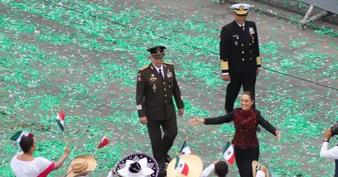 Escoltada por cadetes mujeres del Heroico Colegio Militar, la jefa del Ejecutivo federal y Comandanta Suprema de la Fuerzas Armadas salió de Palacio Nacional a las 10:07 horas, y se digirió a la escolta de bandera para el saludo al Lábaro Patrio. En la asta monumental realizó el izamiento y en ese momento cruzaron en el cielo nueve aeronaves T-6C dejando una estela tricolor.