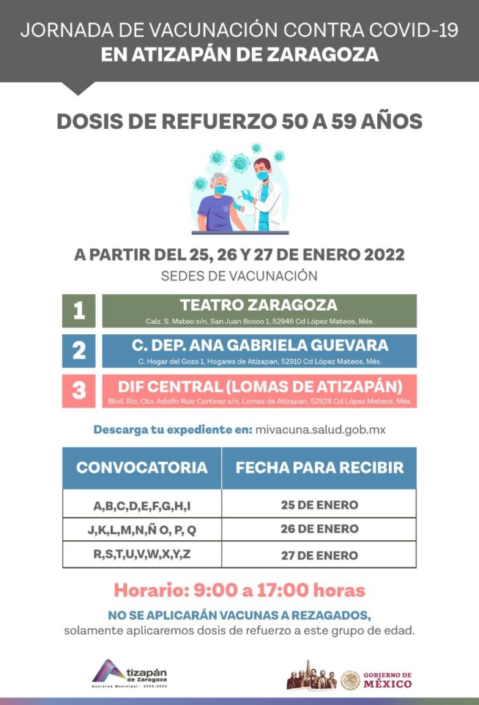 El próximo martes 25 de enero inicia en Atizapán de Zaragoza, la aplicación de tercera dosis de la vacuna contra COVID-19 a la población de 50 a 59 años que hace seis meses completó su esquema de vacunación.