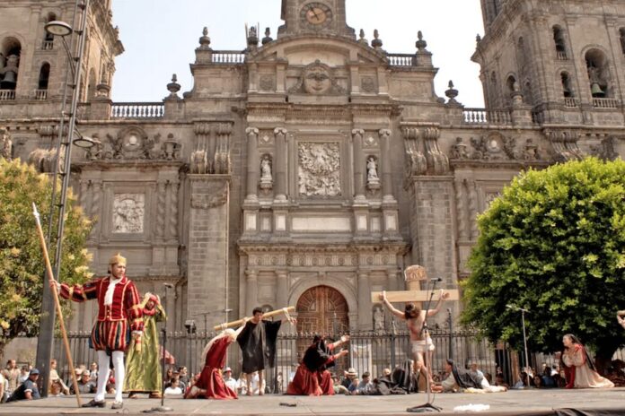 En el Centro Histórico de la Ciudad de México (CDMX), frente a la catedral Metropolitana, se llevó acabo la vigésima quinta representación de la Pasión de Cristo presentada por la compañía nacional de Teatro Clásico Fénix Novohispano.