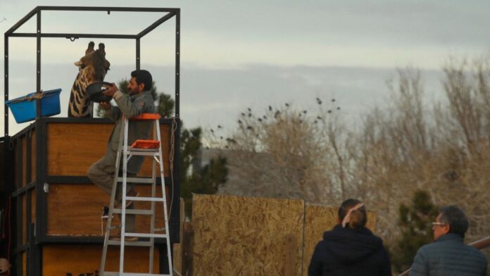 Benito, una jirafa que vivía en condiciones extremas en un parque de Ciudad Juárez, Chihuahua, está siendo trasladada este lunes a un sitio de conservación en el centro del país tras la presión de grupos ecologistas.