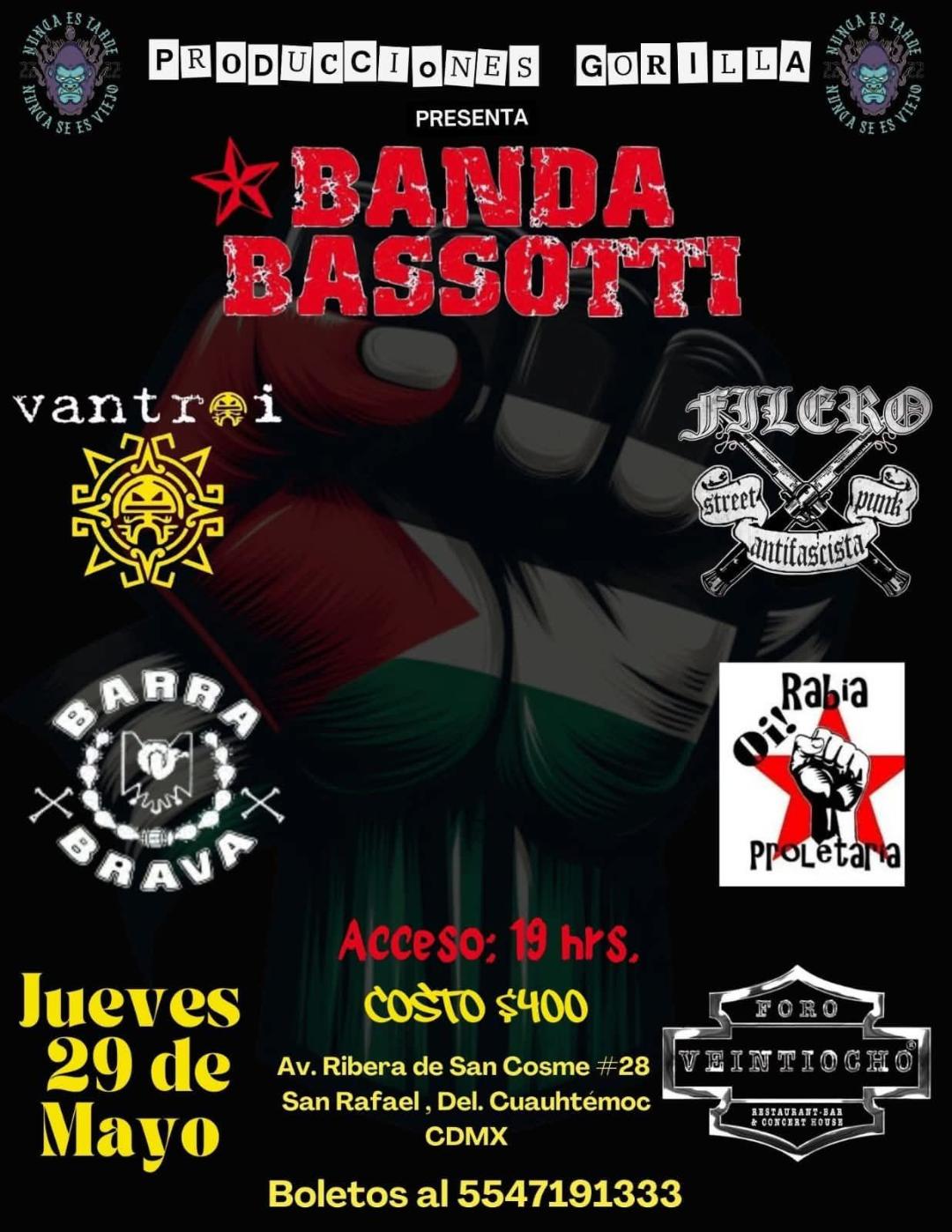 El próximo jueves 29 de mayo de 2025, el Foro Veintiocho de la Ciudad de México será el epicentro de una noche histórica para la escena punk y antifascista. La emblemática Banda Bassotti, originaria de Italia, se presentará en un evento que promete ser un hito cultural y político. Este concierto, organizado por Producciones Gorilla, reunirá a destacadas bandas nacionales como Vantroi, Filero, Barra Brava y Rabia Proletaria, consolidando un cartel que celebra la resistencia y la música combativa.