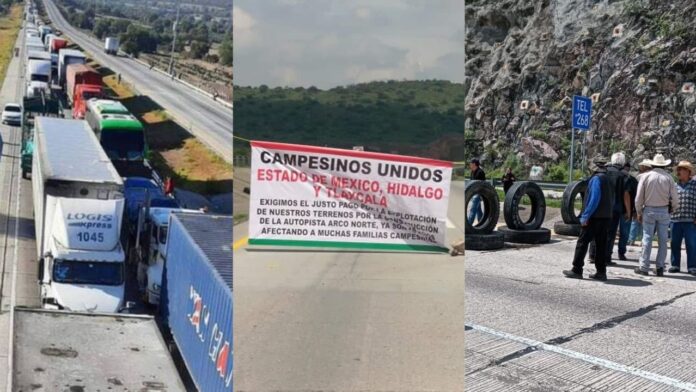Los ejidatarios de Hidalgo, Tlaxcala y el Estado de México mantienen el bloqueo en la autopista Arco Norte, ubicado en el kilómetro 148, entre el Estado de México e Hidalgo.