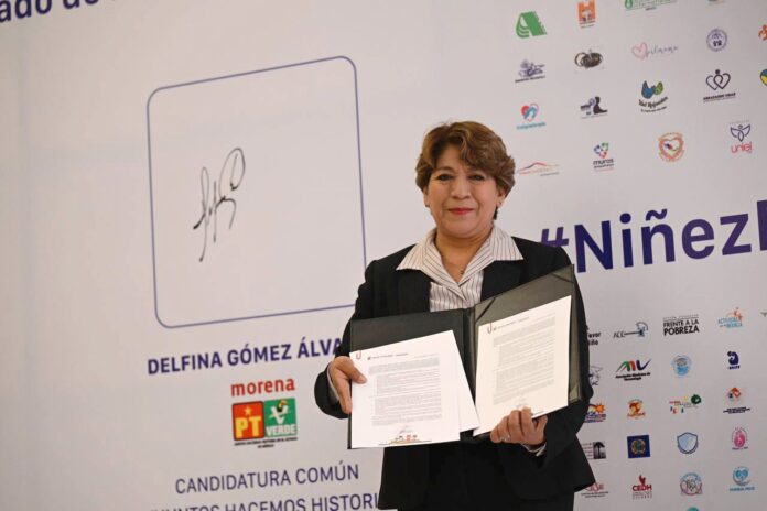 TOLUCA, Estado de México.- La maestra Delfina Gómez, candidata a gobernadora del Estado de México por MORENA, PT y PVEM, refrendó su compromiso con la infancia mexiquense al firmar el Pacto por la Primera Infancia Estado de México 2023, con el que se buscan políticas públicas que garanticen una atención integral a niñas y niños de 0 a 6 años.