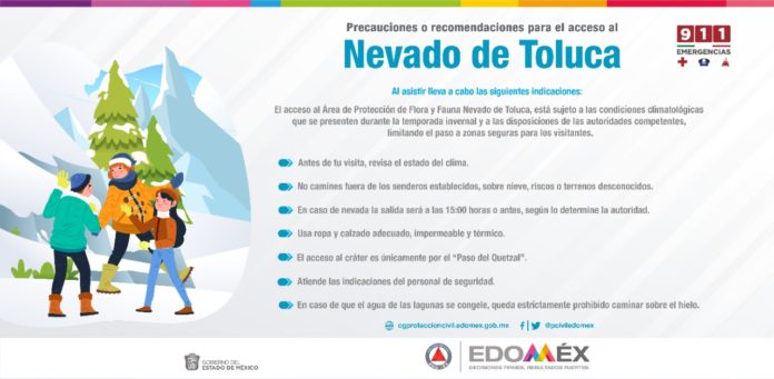 La caída de aguanieve será un punto de atracción en esta temporada invernal, por lo que la Coordinación General de Protección Civil y Gestión Integral del Riesgo del Estado de México, llama a la población a seguir, en todo momento, las medidas de seguridad e indicaciones de las autoridades en su visita a fin de evitar accidentes y/o situaciones que puedan poner en riesgo su salud, integridad y hasta su vida.