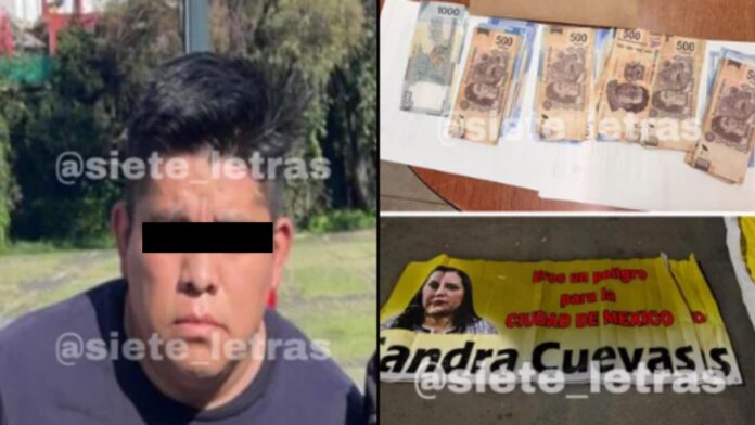 Personal de seguridad lo detuvo mientras intercambiaba el dinero con el equipo de Brugada, en donde además se le encontraron carteles con propaganda en contra de Sandra Cuevas, Ricardo Monreal y Lía Limón.
