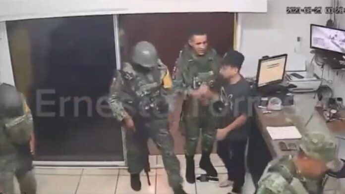 En la grabación se puede observar como un joven se encuentra en el mostrador del negocio, cuando aparentes militares trataron de ingresar por la fuerza, pero tras amenazar al empleado, rompieron la puerta que aseguraba el lugar.