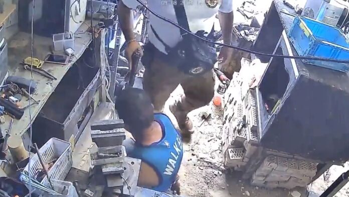 La situación se torna aún más alarmante cuando uno de los presuntos agentes de la Fiscalía saca un arma y la dirige hacia la cabeza del herrero, infundiendo miedo en la víctima que lucha por protegerse en el suelo.