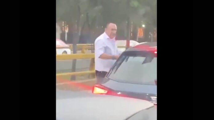 Las imágenes muestran que el auto del agresor, permanece bloqueando la circulación en plena avenida mientras se escucha sonar los claxón de los afectados.