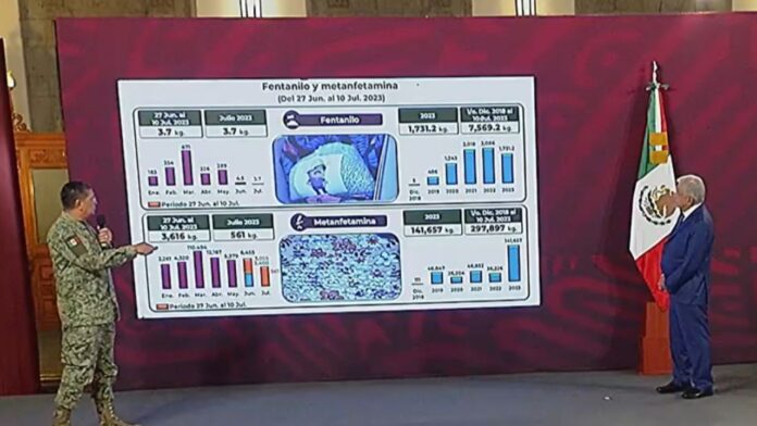 Por su parte, el secretario de la Defensa Nacional dio a conocer que del 27 de junio al 10 de julio se incautaron 3.7 kilogramos de fentanilo y en lo que va del año han asegurado mil 731 kilogramos de la droga sintética, así como siete mil 569 kilogramos durante la administración de López Obrador.