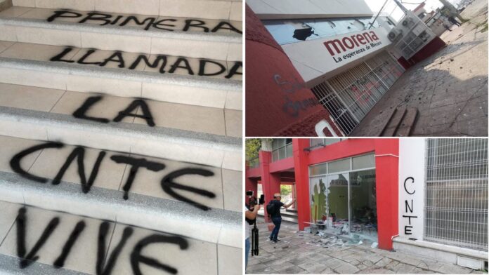 Integrantes de la Coordinadora Nacional de Trabajadores de la Educación (CNTE) incendiaron, vandalizaron y destruyeron oficinas del PRI, Partido del Trabajo, Morena, Movimiento Ciudadano, así como del PAN en Chiapas.