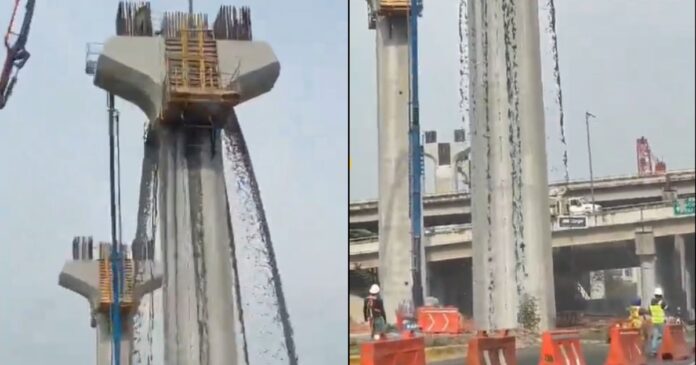 La grabación muestra como chorros de cemento salen de la parte alta de la columna, la cual momentos antes había sido llenada para ser colada con el material, pero por alguna falla desconocida esta se desborda por la parte de abajo.