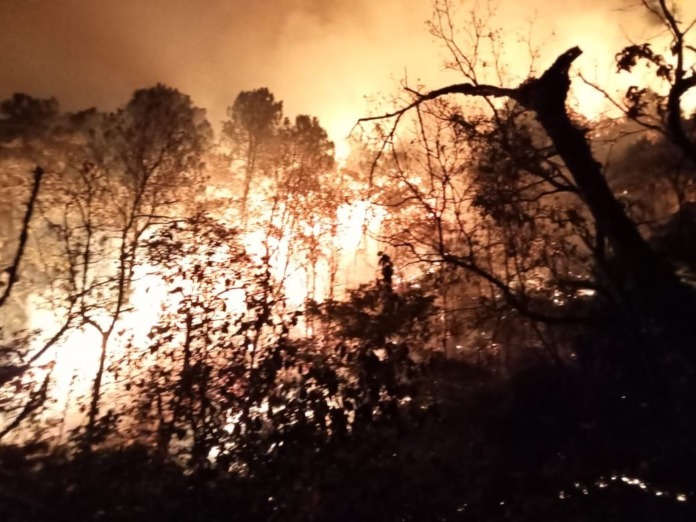 Tejupilco, Estado de México, 21 de abril de 2022. Más de 60 combatientes de fuego de la Protectora de Bosques del Estado de México (Probosque), la Comisión Nacional Forestal (Conafor), ciudadanos y organizaciones ejidales trabajan para sofocar un incendio entre Almoloya de Las Granadas y Tenería, en Tejupilco.