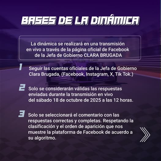 La jefa de Gobierno de la Ciudad de México, Clara Brugada, anunció este viernes a las 23:00 horas, una dinámica para que la población pueda ganarse uno de los 550 pases dobles para asistir a la Fórmula 1, que se llevará a cabo del 24 al 26 de octubre.