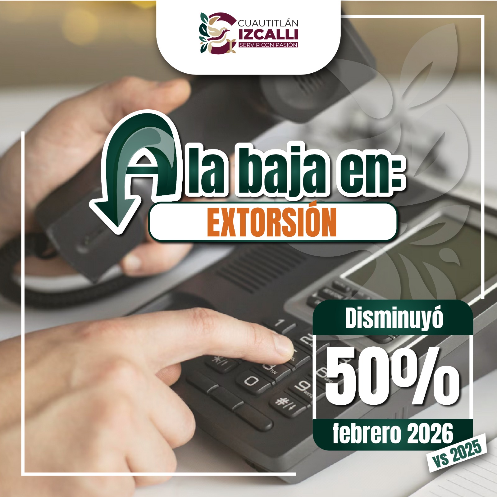 El delito de extorsión en Cuautitlán Izcalli registró una disminución del 50 por ciento durante febrero de 2026, al pasar de ocho casos en el mismo mes de 2025 a cuatro denuncias, de acuerdo con cifras del Secretariado Ejecutivo del Sistema Nacional de Seguridad Pública (SESNSP).