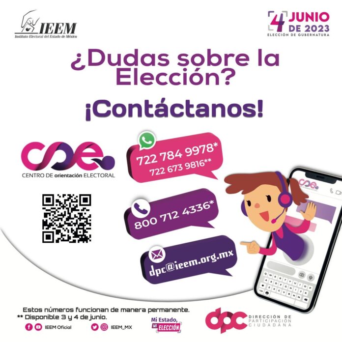 Con la determinación de acercar información a la ciudadanía para que participe en la Jornada del próximo 4 de junio, el Instituto Electoral del Estado de México (IEEM) cuenta con el Centro de Orientación Electoral (COE) para aclarar las dudas sobre ubicación de casillas, modalidades de voto y recomendaciones, entre otras.