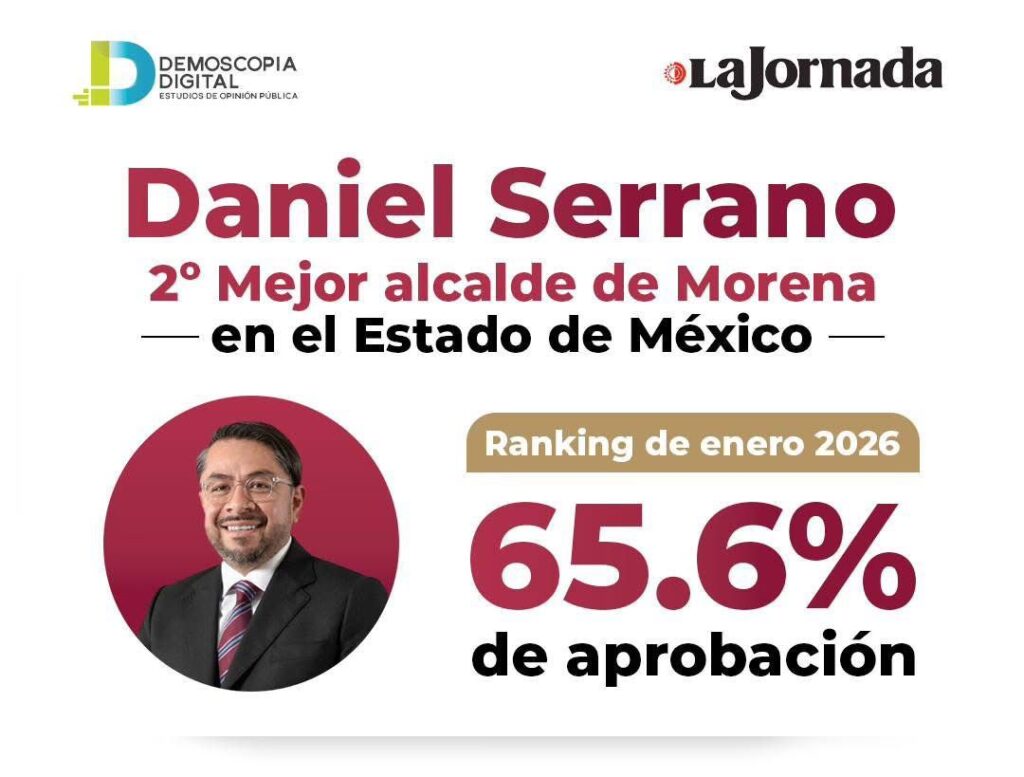 Cuautitlán Izcalli, Edomex. — El presidente municipal de Daniel Serrano alcanzó en enero de 2026 una aprobación ciudadana de 65.6%, de acuerdo con la más reciente medición de Demoscopia Digital, cifra que lo posiciona como el segundo alcalde de Morena mejor evaluado en el Estado de México.