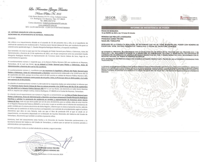 Reynosa, Tam. El secretario del Ayuntamiento de Reynosa, Antonio Joaquín De León Villarreal dio a conocer un documento en donde el Notario Púbico número 305 de esta ciudad, Francisco Garza Treviño, niega la validez del poder notarial presentado por el ex gobernador Francisco Javier García Cabeza de Vaca para tramitar una carta de residencia.