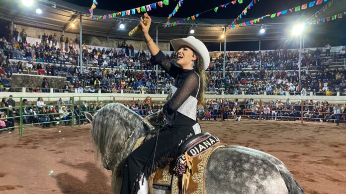 La Feria Regional Tecámac 2023 gozó este viernes la presentación de la artista ecuestre, Diana Laura, combinando un estilo musical con la alta escuela equina, donde al ritmo de su música y la compañía de sus caballos interpretó canciones y melodías del regional mexicano.