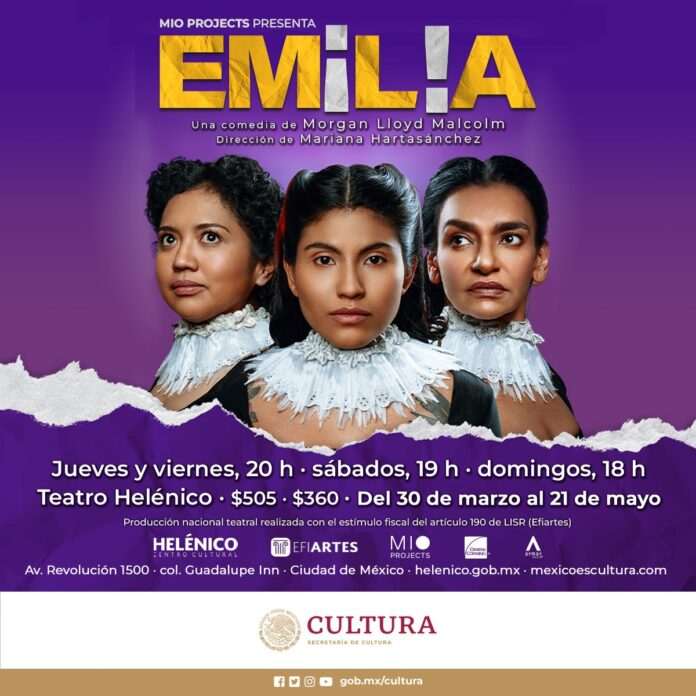 Además, el Teatro Helénico del Centro Cultural Helénico, presenta Emilia, hasta el 21 de mayo. Cuenta la historia de Emilia Bassano, la primera poeta de la lengua inglesa. Las funciones son los jueves y viernes a las 20:00 horas, sábados a las 19:00 horas y domingos a las 18:00 horas.