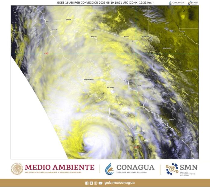 Las extensas bandas nubosas de Hilary propiciarán lluvias intensas (de 75 a 150 milímetros [mm]) en zonas de Baja California, Baja California Sur, costa norte de Sinaloa y costas de Sonora; muy fuertes (de 50 a 75 mm) en regiones de Aguascalientes, Guanajuato, Jalisco, Nayarit y Zacatecas, y fuertes (de 25 a 50 mm) en localidades de Chihuahua y Durango.