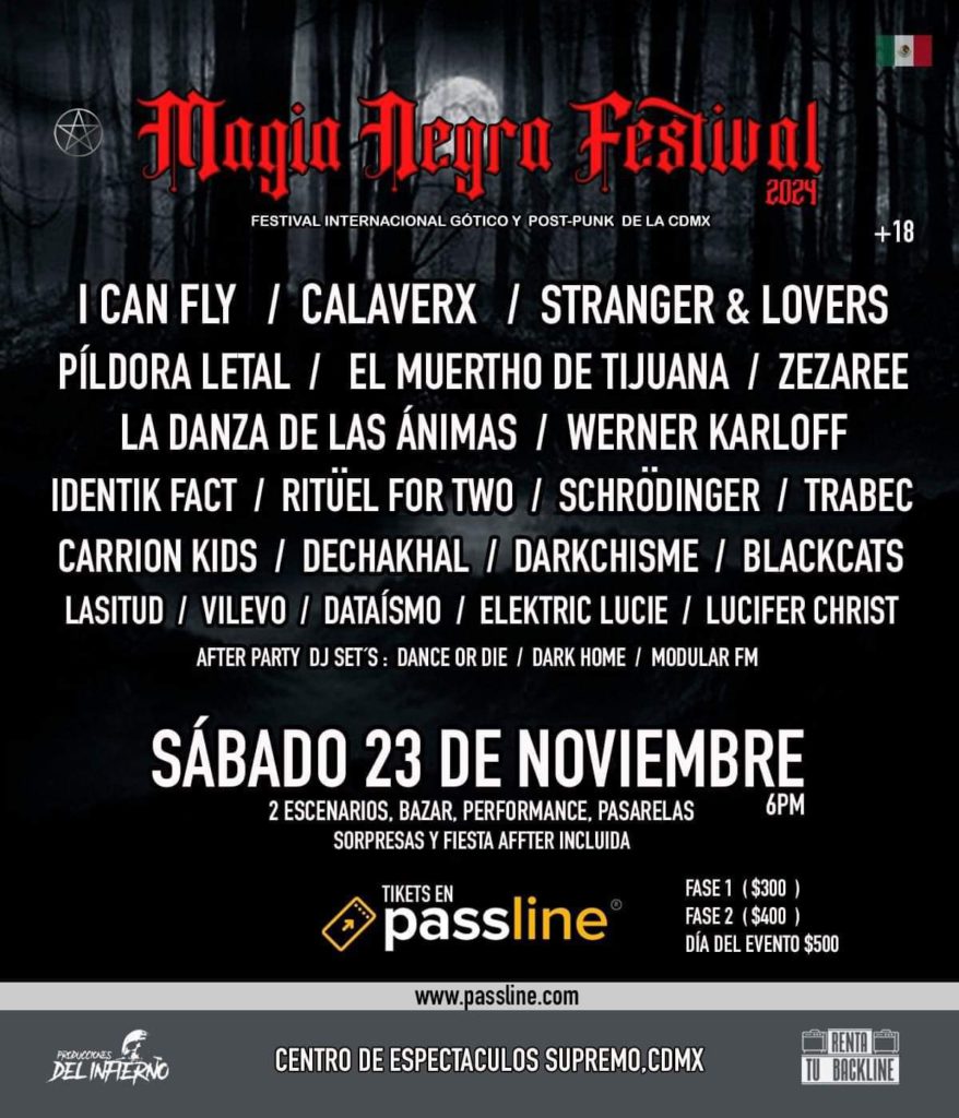El evento que todos los amantes de la música oscura han estado esperando está a punto de regresar a la Ciudad de México. El Festival Magia Negra, conocido por ser “La Noche Más Oscura del Año”, está de vuelta con su esperada cuarta edición que promete superar todas las expectativas. Esta cuarta edición se llevará a cabo se llevará a cabo el próximo 23 de Noviembre en Supremo, ubicado en Dr. Carmona y Valle 147, Colonia Doctores, Cuauhtémoc, Ciudad de México y los boletos ya están a la venta en el Sistema Passline.