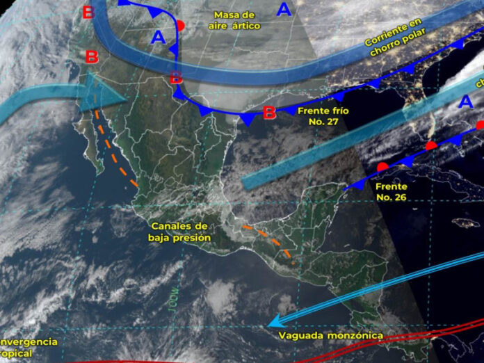 El frente frío 27 y el aire ártico que lo acompaña recorrerán el norte y noreste de la República Mexicana, interaccionarán con un canal de baja presión en el Golfo de México y con las corrientes en chorro polar y subtropical, originarán lluvias y chubascos en el noreste y oriente del país, con posible caída de nieve, aguanieve o lluvia engelante.
