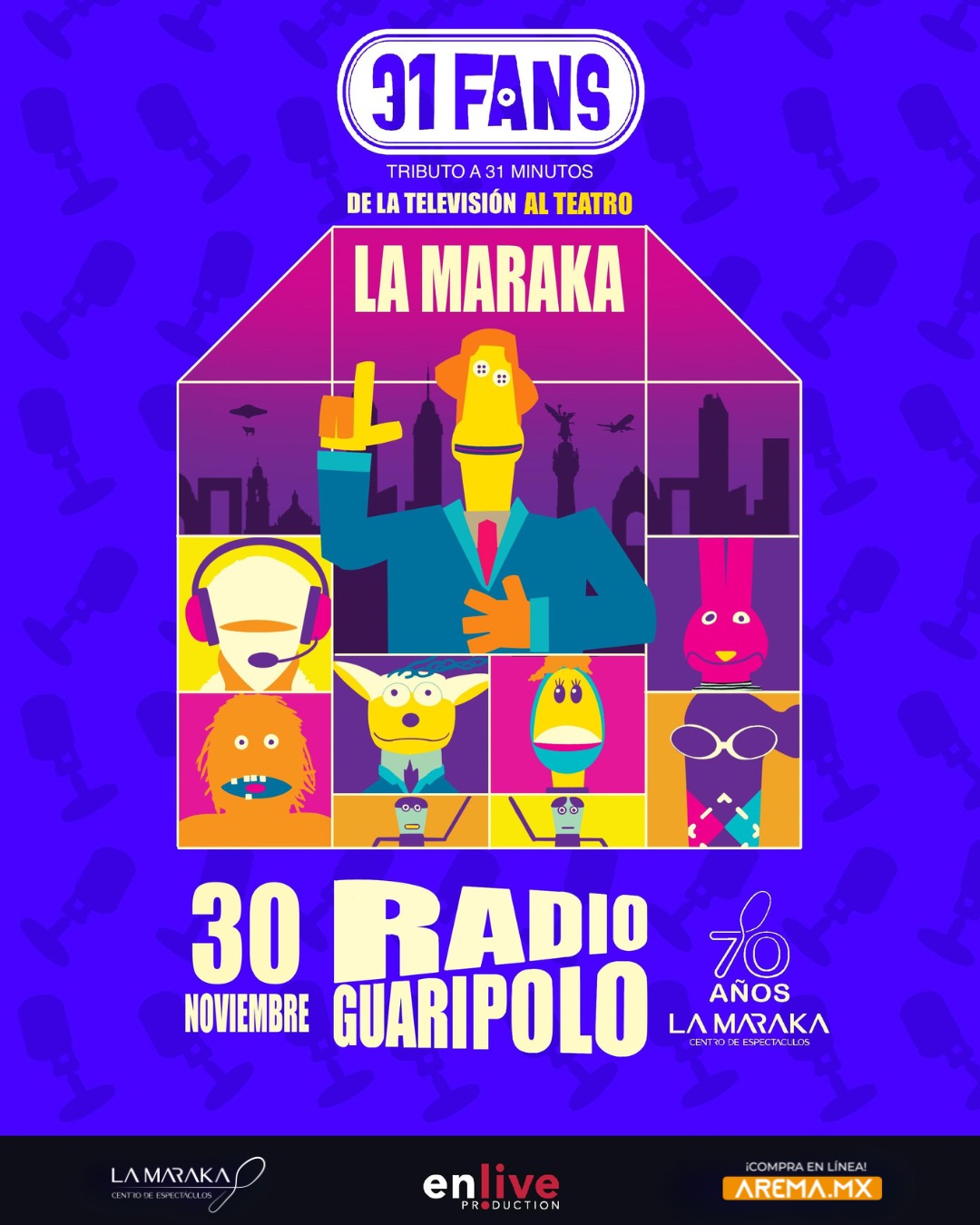 “31 Fans Radio Guaripolo – Tributo a 31 Minutos” llegará a la Ciudad de México el próximo 30 de noviembre de 2025 en La Maraka a partir de las 12pm, con una propuesta que revive la magia, el humor y la irreverencia del noticiero chileno que marcó a toda una generación. Se trata de un espectáculo en vivo que recrea el universo de “31 Minutos” a través de música, títeres y sátira, una experiencia escénica que combina nostalgia, comedia y homenaje para rendir tributo al programa que se convirtió en un fenómeno de culto en toda América Latina organizado por Enlive Producciones. Los boletos para esta presentación ya se encuentran disponibles a través del sistema AREMA.mx y en taquillas del inmueble.