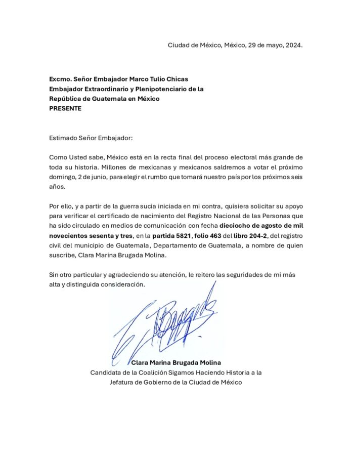 En respuesta a una solicitud de verificación de la candidata de la coalición “Sigamos Haciendo Historia”, la Embajada de Guatemala informó que, tras consultar al Registro Nacional de las Personas (RENAP), se determinó que los datos registrales especificados en el documento – partida 5821, folio 463 del libro 204-2 del Registro Civil del municipio de Guatemala – no coinciden. La consulta reveló que la partida 5821 y el folio 463 del libro 204-2 corresponden a personas distintas y no coinciden con el nombre de Clara Marina Brugada Molina.