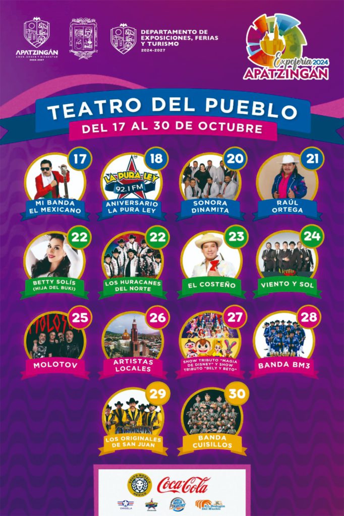 El cartel de la Expoferia 2024 está conformado por artistas de gran renombre a nivel nacional e internacional. Entre ellos destacan Mi Banda El Mexicano, que abrirá el evento el 17 de octubre; la irreverente banda de rock Molotov, programada para el 25 de octubre; Los Huracanes del Norte, quienes pondrán el toque norteño el 22 de octubre; y La Sonora Dinamita, que llenará de cumbia el 20 de octubre. Además, la hija de Marco Antonio Solís, Betty Solís, hará una presentación especial el 22 de octubre. “Estamos muy emocionados de contar con estos talentos que harán vibrar el escenario del Teatro del Pueblo”, subrayó la presidenta municipal.
