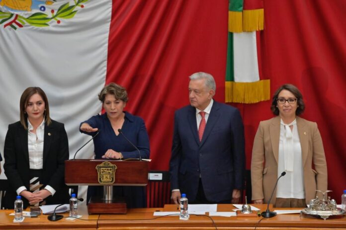 Toluca, Méx., a 14 de septiembre de 2022. En un hecho histórico en el Estado de México, la Presidenta de la Mesa Directiva de la Legislatura local, Azucena Cisneros tomó protesta a la primera gobernadora de la entidad, Delfina Gómez Álvarez, para el periodo 2023-2029, ante la presencia del Presidente de la República, Andrés Manuel López Obrador, en el inicio de lo que será una gestión estatal transparente, inclusiva que busca el desarrollo de todas y todos los sectores, y sin privilegios a servidores públicos.
