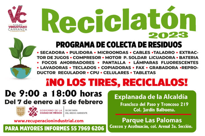 Con el objetivo de no contaminar el medio ambiente con basura tecnológica, Evelyn Parra Álvarez, Alcaldesa de Venustiano Carranza, informó que su gobierno llevará a cabo el programa Reciclatón “Salvemos al mundo” del 7 de enero al 5 de febrero en la explanada de la demarcación y en el Parque las Palomas, ubicado en la colonia Arenal 3a. Sección.