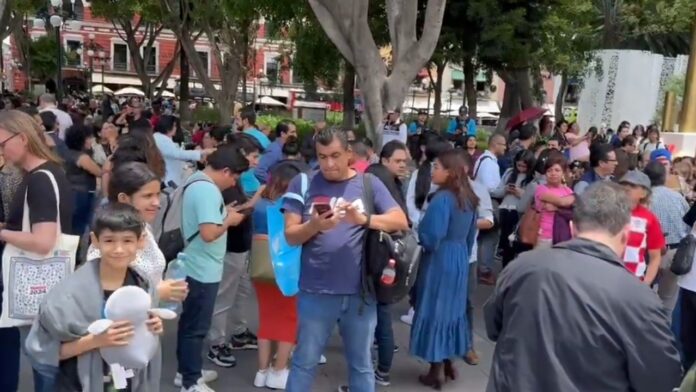 En el Zócalo de Puebla, las personas procedieron a evacuar los inmuebles tras la activación de la alerta.