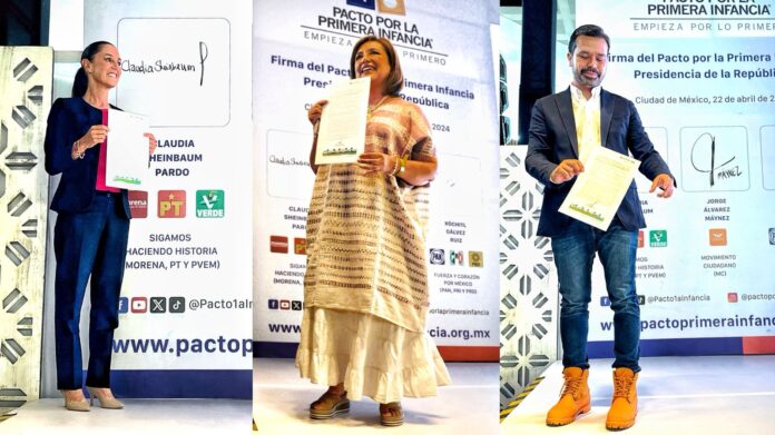 Al ritmo de “Hagamos de México el mejor lugar para nacer y crecer. Firma el Pacto ya”, las candidatas y el candidato a ocupar la Presidencia de la República en los próximos seis años, Claudia Sheinbaum Pardo, Xóchitl Gálvez Ruiz y Jorge Álvarez Máynez,firmaron el Pacto por la Primera Infancia y las 12 metas planeadas para lograr el bienestar y el desarrollo de 12.4 Millones de niñas y niños en primera infancia en México.