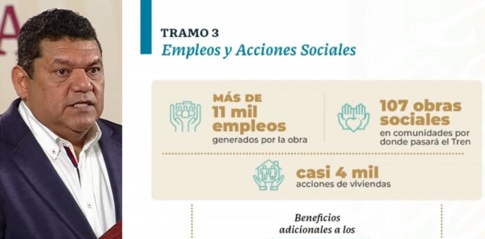 “La fabricación de trenes continúa, se generan 11 mil empleos, en el Tramo 3 las obras avanzan a buen ritmo y sin descanso para cumplir el compromiso de inaugurar en diciembre de 2023”, señaló.