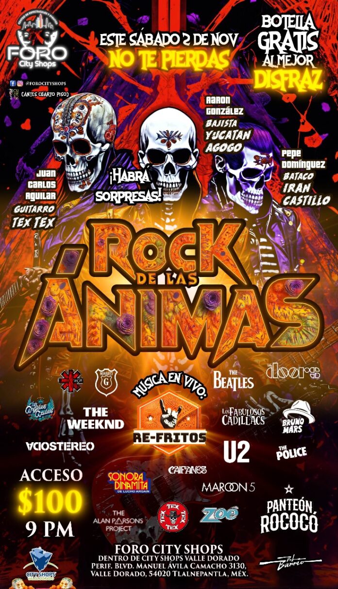 La apertura estará marcada por la presentación estelar de Rock de las Ánimas, un proyecto que reúne a músicos de trayectoria en la escena nacional. La alineación incluye a Juan Carlos Aguilar, legendario guitarrista de Tex Tex; Aarón González, reconocido bajista de Yucatán A Go Gó; y Pep Domínguez, baterista de Irán Castillo. Juntos, interpretarán una selección de canciones que han dejado huella en el rock nacional e internacional, con el fin de encender la inauguración de este foro y hacer de la noche del 2 de noviembre una experiencia inolvidable para los asistentes.