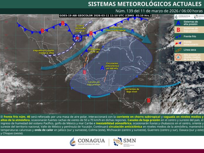 El Servicio Meteorológico Nacional (SMN) informó que este 11 de marzo de 2026 el frente frío número 40, reforzado por una masa de aire polar, se desplazará sobre el norte y noreste de México, generando rachas de viento de hasta 70 kilómetros por hora, lluvias aisladas y un marcado contraste de temperaturas en distintas regiones del país.