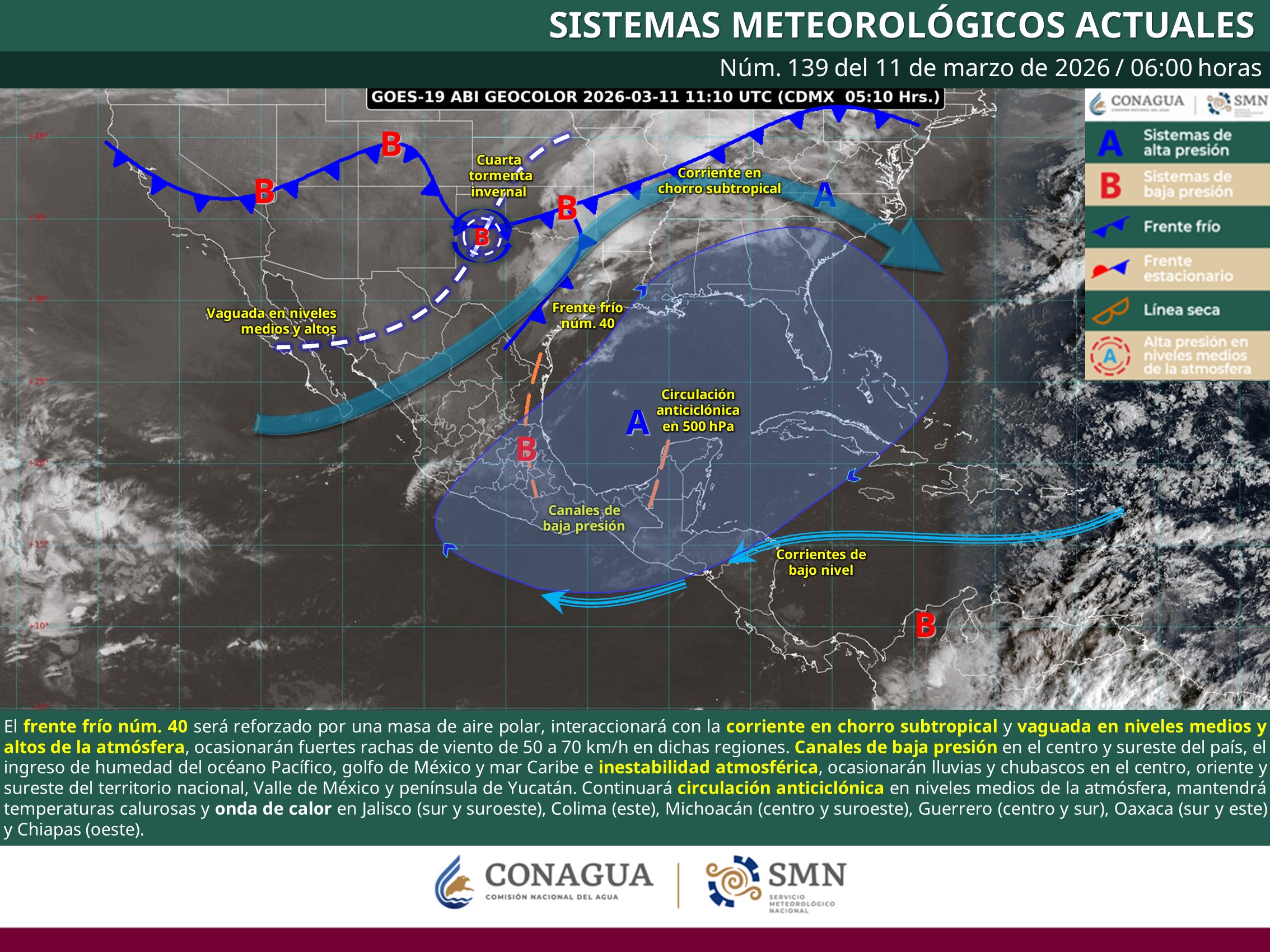 De acuerdo con el organismo dependiente de la Comisión Nacional del Agua (Conagua), el sistema frontal interactuará con la corriente en chorro subtropical y una vaguada en niveles medios y altos de la atmósfera, lo que favorecerá vientos intensos en estados del norte y noreste, además de precipitaciones aisladas en Tamaulipas y San Luis Potosí.
