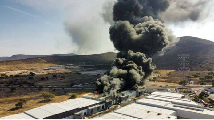 Un fuerte incendio consumió una nave industrial en el Parque Industrial Pyme, ubicado a un costado de la carretera estatal 431, cerca de la comunidad de San Fandila, entre Pedro Escobedo y Huimilpan, en Querétaro.