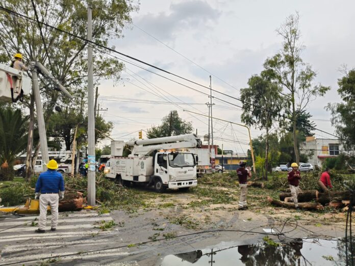 Además, acudió personal de la Comisión Federal de Electricidad (CFE) para atender afectaciones al cableado de energía eléctrica provocadas por las ramas, a fin de restablecer el servicio en caso de interrupciones.