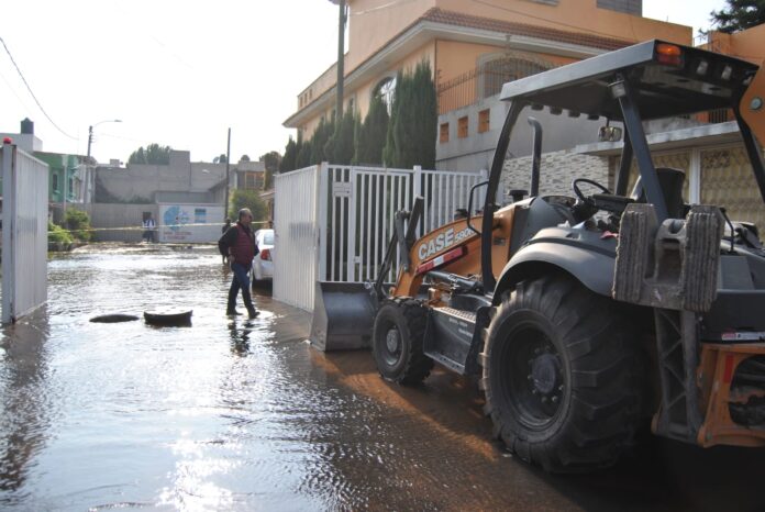 Personal del organismo de Servicios de Agua Potable, Alcantarillado y Saneamiento de Ecatepec (SAPASE) en coordinación con elementos e Protección Civil y Bomberos del municipio, trabajan para desalojar el agua del lugar, causando afectaciones en la intersección de la calle Dalias y Amapolas en Izcalli Ecatepec.