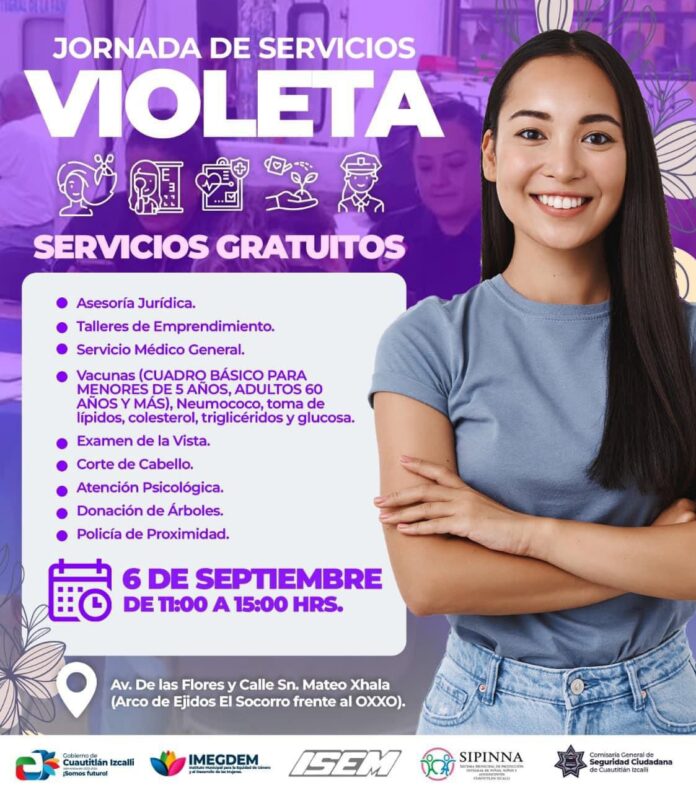 Con el objetivo de seguir brindando servicios a la comunidad izcallense, el Gobierno Municipal de Cuautitlán Izcalli el cual encabeza Karla Fiesco te invita este 6 de septiembre a la “Jornada de Servicios Violeta” de 11:00 a 15:00 horas en la Avenida de las Flores y Calle San Mateo Xhala (Arco de Ejidos El Socorro frente al Oxxo).