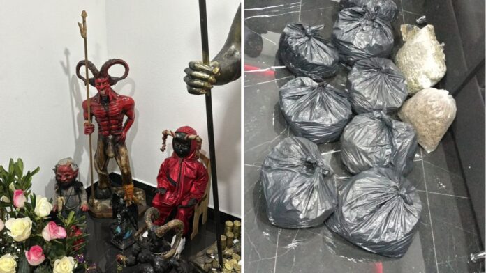 Los agentes también informaron sobre la presencia de un altar con figuras del diablo y Lucifer rodeadas por arreglos de flores, que también fueron aseguradas.