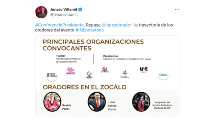 El INE utilizó su cuenta oficial de Twitter para calificar como falsa una afirmación hecha por el periodista y funcionario Jenaro Villamil, quien durante la conferencia de prensa del presidente López Obrador, compartió una lámina que mostraba a integrantes del Servicio Profesional Electoral del INE como organizadores de la manifestación.